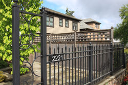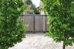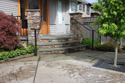 The client won the case and in doing so was given back the small portion of property on the fence line which allowed him new concrete wall and fence construciton for the the length of the property. We continued wit the design of the curved stone base under both turrets on the house, the new curved front porch with curved iron railining, a new driveway and custom garbage enclosure, the address is a steel box internally lit to illuminate the cut out address numbers. A new low stone wall and stone patio, and stone walk were designed as well as a metal gate way inpired by the glass detail on the front door.